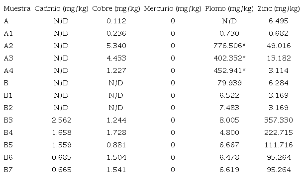 El plomo es el metal pesado con mayor presencia en las muestras de suelo y agua. Sus valores exceden la normatividad mexicana. La ingesta de este metal pesado por los pobladores representa el principal riesgo.