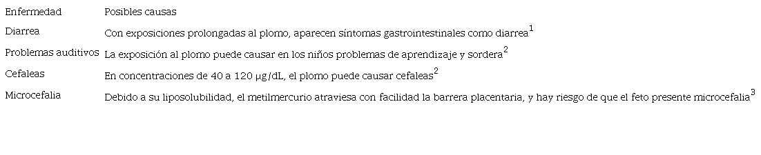 Diversos autores han destacado los riesgos de salud por presencia de metales pesados. Canfield et al. (2003) destacan un dato epidemiológico relevante: los niños son los más sensibles al plomo, y los deterioros neurológicos comienzan a partir de 10 µg/dL de plomo en sangre. En el mismo sentido, Needleman (2004) identifica que niveles de plomo superiores 60 µg/dL desencadenan en niños síntomas como dolores abdominales, artralgia y encefalopatías. El plomo se fija en la superficie de la membrana celular, cuya permeabilidad y transporte activo son alterados. Batool et al. (2017) son contundentes al afirmar que el plomo tiene la capacidad de interactuar con las proteínas al imitar las funciones del calcio.