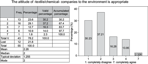 The attitude of textile and chemical TNCs to the environment is inappropriate (Figs. 1 and 2). With respect to the information received and analyzed on the answers to the question “The attitude of -textile/chemical- companies to the environment is appropriate”, according to the percentage of affinity collected, there was consensus among the participants when it came to tending against the proposal. The sum of the values with the highest affinity were 1, 2 and 3, totaling 83.7 %.