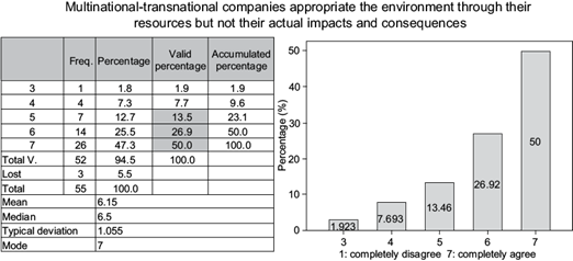 With respect to the information received and analyzed on the answers to the question “Multinational-transnational companies appropriate the environment through their resources but not their actual impacts and consequences”, there was consensus among the participants when it came to tending towards the proposal. The sum of the values with the highest affinity were 5, 6 and 7, totaling 90.4 %. Values 1 and 2 received no affinity ranking. TNCs collect natural resources but not the real consequences of the use and transformation of these (Kant, 2012). For this, the private particularities of TNCs are transformed and legitimized as public or state interests, regulating in favor of trade, even over impacts and environmental sequelae (Underhill, 2016), thus fostering an unsustainable textile industry model (Luz 2007).