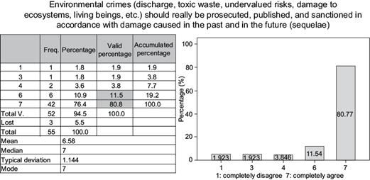 It is necessary to prosecute environmental crimes in a meaningful way (Fig. 3). With respect to the information received and analyzed on the answers to the question “Environmental crimes (discharge, toxic waste, undervalued risks, damage to ecosystems, living beings, etc.) should really be prosecuted, published, and sanctioned in accordance with damage caused in the past and in the future (sequelae)”, according to the percentage of affinity recorded there was consensus among the participants when it came to tending towards the proposal. The sum of the values with the highest affinity were 6 and 7, totaling 92.3 %.