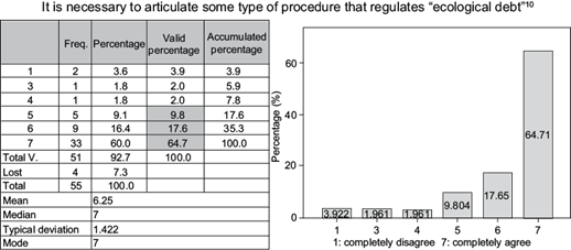 It is necessary to develop ecological debt as a conceptual tool (Fig. 4). With respect to the information received and analyzed on the answers to the question “It is necessary to articulate some type of procedure that regulates “ecological debt”, according to the percentage of affinity collected there was consensus among the participants when it came to tending towards the proposal. The sum of the values with the highest affinity were 5, 6 and 7, totaling 92.1 %.