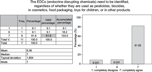 Endocrine disruptors merit a special mention (Fig. 5). These substances must be completely evaluated and identified. With respect to the information received and analyzed on the answers to the question “EDCs (endocrine disrupting chemicals) need to be identified, regardless of whether they are used as pesticides, biocides, in cosmetics, food packaging, children’s toys, or in other products”, according to the percentage of affinity collected there was consensus among the participants when it came to tending towards the proposal. The sum of the values with the highest affinity were 6 and 7, totaling 90.9 %.