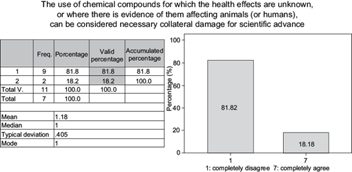 The use of chemical compounds for which the health effects are unknown, or where there is evidence of them affecting animals and humans, cannot be considered necessary collateral damage for scientific advance (Fig. 6). With respect to the information received and analyzed on the answers to the question “The use of chemical compounds for which the health effects are unknown, or where there is evidence of them affecting animals (or humans), can be considered necessary collateral damage for scientific advance”, according to the percentage of affinity collected there was consensus among the participants when it came to tending against the proposal. The sum of the values with the highest affinity were 1 and 2, totaling 100 %.