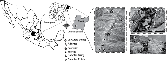 The Aurora mine is located 6 km from the town of Xichú, Guanjuato, México. It is an abandoned mine site that has four tailing deposits exposed to the environment, so they are prone to incidents of leaching and suspension by wind and water. The waste was generated when there was no environmental regulation and may be considered as an environmental liability; it does not meet the requirements of the Mexican Official Standard NOM-141-SEMARNAT-2003 (SEMARNAT 2005), which establishes the criteria for the construction, operation and post-operation of tailing dams.