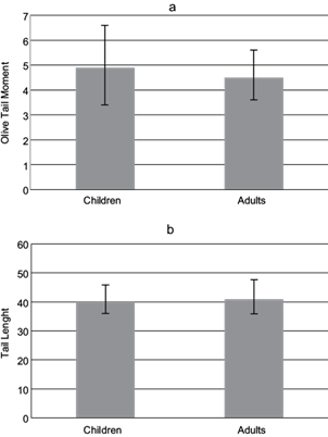 Regarding DNA damage (Fig. 2), the average OTM was 5.0 ± 1.6 for children and 4.6 ± 1.0 for adults (Fig. 2a), while the average TL was 40.9 ± 4.9 and 41.8 ± 5.9 µm for children and adults, respectively (Fig. 2b).