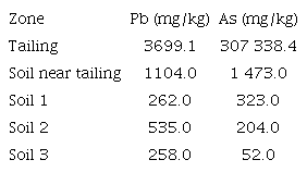 Regarding As, the mine tailing sample highly exceeded the limits set by Mexican regulations. Soil samples exceeded from 2.4 to 66.9 times the reference value of 22 mg/kg, being the soil near the mine tailing (Table I) the one with the highest level.
