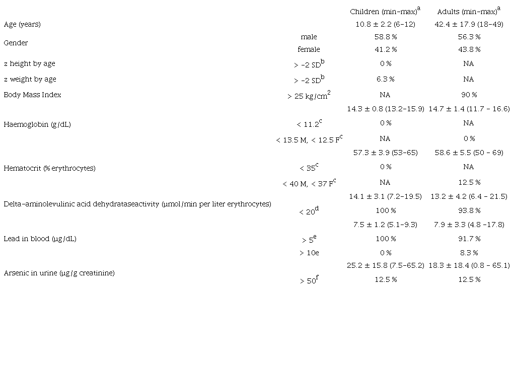 In the present study, 100 % of the children presented values over 5 μg/dL (Table II). Regarding As in urine, a small percentage of children (12.5 %) and adults (12.5 %) exceeded the limits set by the CDC of 50 µg/g creatinine (Table II).