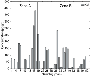 It was found that the concentrations of Cd in the analyzed samples ranged from 0.451 to 432.81 µg/g for both zones where samples were collected (Fig. 3). The highest Cd concentrations were recorded in zone A.