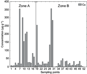 Figure 4 shows that the Cu concentration values ranged from 0.034 to 356.91 µg/g. The sampling points closest to the emission source had the highest concentrations of this metal. Mohanraj et al. (2004) reported that heavy metals in airborne particulate matter, such as Cu, can also be attributed in part to vehicular emissions. This finding can be supported by the fact that there was a permanent traffic of 530 big lorries transporting harvested sugarcane from the fields to the sugar mill. Moreover, the traffic of public transportation and private local vehicles was also observed.