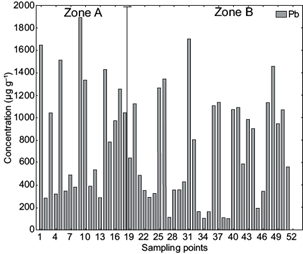 The Pb results obtained herein showed an upward behavior in concentrations, which were observed in a range from 101.45 to 1892.1 μg/g (Fig. 5).