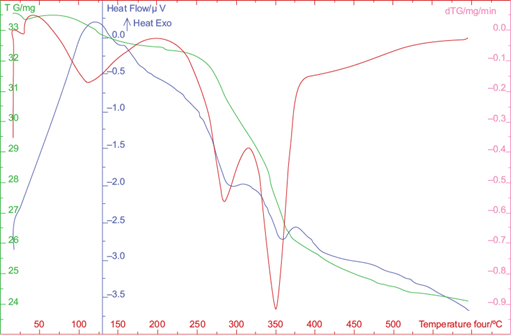 In the first zone (25-200 ºC) endothermic evaporation of residual water occurred, corresponding to a mass loss of absorbed moisture of approximately 1 %.