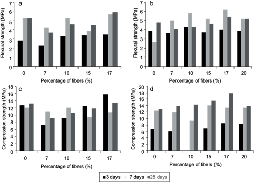 The results of flexural strength are presented in figure 4a, b. There were not relevant effects of the fibers on the flexural strength from day 3 to 28, except for the sample incorporating 17 % of fibers in the formulation. The last sample shows an enhancement in mechanical properties at different ages compared to the reference composite. At day 28, the improvements were approximately 11 % for this sample.