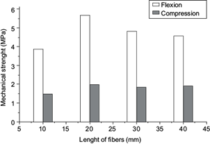 The addition of 17 % of fibers with different lengths influences the rheological behavior of the plaster. The reduced flexural strength is generally caused by the loss of maneuverability, which is due to poor distribution of the fibers in the fresh state and leads to increasing porosity. Concerning the compressive strength, there is a slight improvement, reaching a maximum for fiber lengths of 20 mm and then a slow decrease for the lengths of 30 and 40 mm (Fig. 5). This decrease may be due to unsuitable compactness and workability caused by excess of fibers in the mixture.