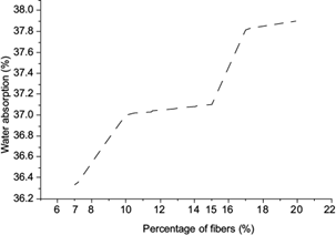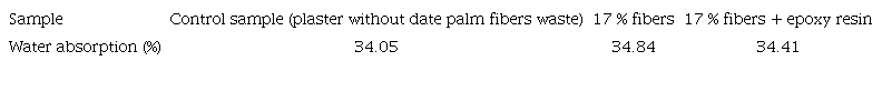 Figure 6 shows a correlation between the increasing percentages of DPFW, which tend to increase water absorption. Increasing the percentages of DPFW from 7 to 20 % in the plaster mortar resulted in an increase of water absorption. This behavior is attributed to the porosity of fibers and their hydrophilic character, which is mainly due to the presence of hemicelluloses.