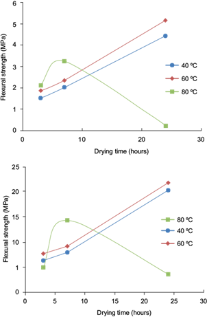 The rheological behavior shows the same evolution at a drying temperature of 40 and 60º C. The flexural and compressive strengths increase with the drying time (Fig. 7). However, these parameters exhibit a large drop for a drying time of 24 h at 80 ºC (flexural = 0.234 MPa, compression = 3.65 MPa).