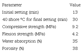 The plaster (DecoM2) used in this study was provided by the SIPS company and is ISO 9001 certified. The setting behavior of the plaster was characterized by common penetration procedures (knife cut for the initial setting and 40 shore C for the final setting) according to French standard NF B12-401. The grain size distribution was determined using wet sieving (Table I). The physical and mechanical properties of used plaster are presented in table II and figure 1.