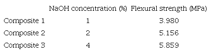 The mechanical properties of the studied fibers before and after the treatment with different percentages of NaOH are shown in table III. An improvement in the flexural strength of the DPFW was observed when the alkali treatment was applied. This enhancement can be explained by the removal of the significant parts of lignin, hemicelluloses, wax and oils covering the external surface of the fibers (Li et al. 2007). This modification facilitates the rearrangement of fibrils (Fig. 3b, d) along the direction of flexural deformation. Furthermore, the improvement of strength can be due to the increase of cellulose content and the compactness of the fibers (Sathishkumar et al. 2013).