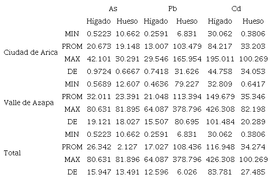 Considerando a todos los individuos (n = 26), las concentraciones de Pb en hígado promediaron 1.7 μg/g, con un mínimo de 0.26 μg/g y un máximo de 6.41 μg/g (con desviación estándar [DS] = 1.259), mientras que en tejido óseo promediaron 10.84 μg/g y variaron de 6.83 μg/g a 37.88 μg/g (DS = 6.03). En el caso del Cd en hígado, el valor promedio fue de 11.69; el mínimo encontrado fue de 3.01 μg/g y el máximo de 42.63 μg/g (DS = 8.38). En tejido óseo el promedio fue de 3.43 μg/g, con un valor mínimo de 0.38 μg/g y un máximo de 10.03 μg/g (DS = 2.75). Finalmente, con relación al As, el promedio encontrado en tejido hepático fue de 2.63 μg/g, con un valor mínimo de 0.52 μg/g y un valor máximo de 8.06 μg/g (DS = 1.59). En tejido óseo, el promedio fur de 2.13 μg/g, con un mínimo de 1.07 μg/g y un máximo de 8.19 μg/g (DS = 1.35) (Cuadro I).