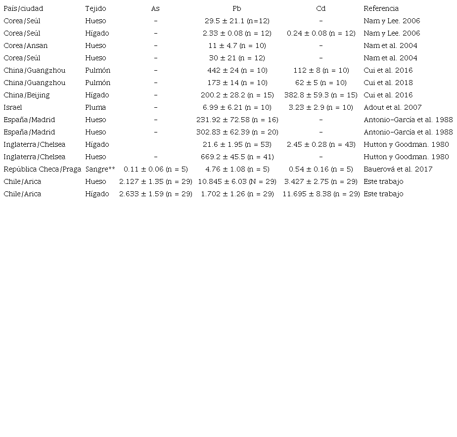 Este trabajo es uno de los primeros en evaluar la presencia y concentraciones de Pb, As y Cd en poblaciones naturales del extremo norte de Chile. Previamente se han evaluado aves costeras de la ciudad de Arica (Maulén 2014), especies en que las concentraciones de Pb son consideradas bajas (0.15 ± 0.14 μg/g en hígado [0.00 a 0.49 μg/g] y 0.26 ± 0.24 μg/g en hueso [rango 0.07 a 1.2 μg/g]), particularmente porque se alimentan en amplias zonas geográficas, desplazándose incluso mar adentro, lugares poco relevantes con relación a la contaminación por metales pesados.