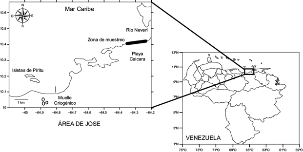 Los ejemplares adultos de la almeja T. mactroides (de 30 a 40 mm de longitud anteroposterior) fueron recolectados manualmente en Playa Caicara, en el área costera del morro de Barcelona hasta el litoral de la costa de Jose (10º 09’ 06’’-10º 09’ 00’’ N y 64º 43’ 06’’-64º 55’ 00’’ W) (Fig. 1). La zona costera de recolección se encuentra en las cercanías de la planta de fraccionamiento del Complejo Criogénico de Oriente perteneciente a Petroquímica de Petróleo de Venezuela (Pequiven) y de la desembocadura del río Neverí. La abundancia estimada de la población de T. mactroides en Playa Caicara es de ≈ 50.84 ind m-2 (Arrieche y Prieto 2006).