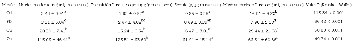 Las concentraciones de metales pesados estimadas en todo el tejido blando de T. mactroides presentaron variaciones durante las distintas temporadas pluviométricas (Cuadro I). De manera general, los promedios de Cd, Pb y Cu se mostraron más elevados durante los periodos lluviosos y la transición lluvia-sequía, y los menores promedios se observaron en el periodo de sequía. Adicionalmente, en el periodo de máximas lluvias, las concentraciones de Cd (16.01 ± 9.30 µg/g masa seca) y de Pb (7.90 ± 5.13 µg/g masa seca), también expresadas en la unidad µg/g masa fresca (2.96 ± 1.52 µg Cd/g y 2.18 ± 1.20 µg Pb/g), superaron los límites permisibles recomendados por la organización Mundial de la Salud y la Organización de las Nacionales Unidad para la Alimentación y la Agricultura (FAO/WHO 2018), la Comisión Europea (EC 2017) y la Agencia Nacional de Vigilancia Sanitaria del Brasil (ANVISA 2013). Estas organizaciones sugieren valores de concentraciones límites en tejidos blandos de bivalvos menores a 2.0 µg/g masa fresca para Cd y por debajo de 1.5 µg/g masa fresca para Pb. El Cu presentó sus mayores promedios durante ambos periodos lluviosos y la transición lluvia-sequía; y los mayores promedios de Zn fueron observados durante periodos de lluvias moderadas y la transición lluvia-sequía.