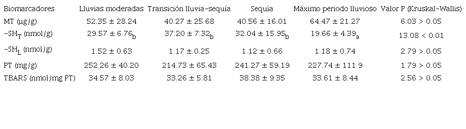 Los niveles de MT, grupos -SHL, PT y TBARS en la glándula digestiva de T. mactroides no mostraron diferencias significativas durante los distintos periodos pluviométricos examinados. No obstante, las concentraciones de -SHT mostraron un descenso significativo en la temporada de máxima pluviosidad (Cuadro II).