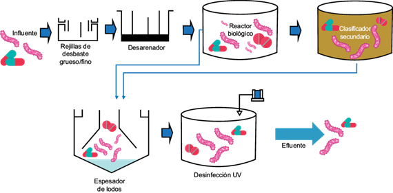 Las PTAR son consideradas como puntos de acceso y selección de bacterias resistentes. Albergan una alta densidad y diversidad de bacterias ambientales asociadas con humanos y animales (incluidos los patógenos), y tienen diversos factores de resistencia a antibióticos que pueden intercambiarse entre ellas (Bengtsson-Palme et al. 2016, Manaia et al. 2018). No obstante, el efecto del tratamiento de agua residual sobre la resistencia bacteriana se ha estudiado en todo el mundo. Varios autores han investigado la selección de resistencia bacteriana mediante la comparación de poblaciones de bacterias en el influente y el efluente, lo que ha producido resultados variables y a veces contradictorios (Flach et al. 2018). Si bien los resultados no siempre son consistentes, se han encontrado patrones, y en algunos casos se han observado aumentos de resistencia bacteriana a múltiples antibióticos (Grabow et al. 1974, Linton et al. 1974, Mezrioui y Baleux 1994).