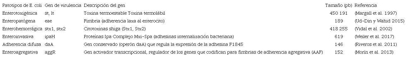 En las cepas de E. coli seleccionadas se realizó la extracción de ADN por el método de choque térmico como lo describen Garza-Ramos et al. (2018). Se incluyeron cepas control para el estudio de los patotipos. Todas las reacciones en cadena de polimerasa múltiplex (PCRm, por sus siglas en inglés) fueron realizadas en un termociclador Biorad Mycycler TM, en un volumen final de 25 μL con el siguiente contenido por reacción: amortiguador, 2.5 μL; MgCl2, 2.5 μL; dNTP, 2.5 μL; oligonucleótido F, 2.0 μL; oligonucleótido R, 2.0 μL; H2O, 3 μL; Taq polimerasa, 0.5 μL partiendo de una concentración comercial de 5 U/μL. Cabe mencionar que en cada mix de PCRm se incluyeron dos pares de oligonucleótidos para la amplificación de los genes específicos por patotipo, los cuales se describen en el cuadro I. Las reacciones se sometieron a un paso de desnaturalización inicial a 95 ºC durante 1 min, seguido de 35 ciclos que consisten en desnaturalización a 95 ºC durante 45 s, hibridación a 58 ºC durante 1 min, extensión a 72 ºC durante 1 min y elongación final a 72 ºC durante 7 min (Omar y Barnard 2010). El control positivo contenía una mezcla de cepas de E. coli correspondiente a los seis patotipos. El control negativo contenía solo agua mili Q. Los amplificados de la PCR fueron sometidos a electroforesis en un gel de agarosa al 1 % teñido con bromuro de etidio (3 μL/100 mL) a 120 V por 1 h en solución amortiguadora TAE 1X. Posteriormente, fueron visualizados con luz UV.