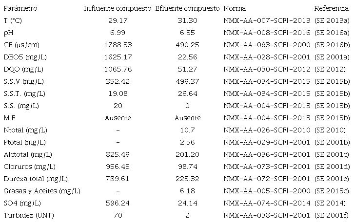 En el momento de cada muestreo se registraron in situ la temperatura, el pH y la conductividad eléctrica (Ce). Además, se midieron los siguientes parámetros: demanda química de oxígeno (DQO), demanda bioquímica de oxígeno (DBO5), dureza total, turbidez, sólidos suspendidos volátiles (SSV), sólidos suspendidos totales (SST), coliformes fecales, totales y E. coli, y se determinó el número más probable (NMP) con base en la Norma Mexicana NMX-AA-042-SCFI-2015 (SE 2015a) en el laboratorio de análisis químico ambiental de la Universidad Autónoma de Guerrero, considerando las normas vigentes correspondientes (SEMARNAT 1996a, b, 1997). Con los datos obtenidos se calculó el porcentaje de eficiencia de remoción del reactor biológico (con en la DBO5):