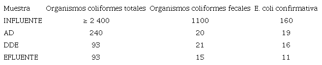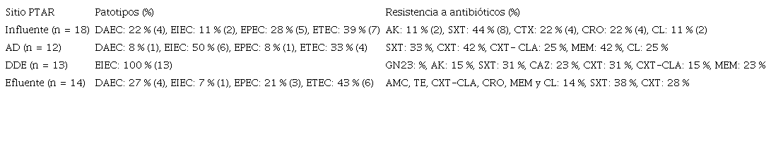 En cuanto a la presencia de E. coli, se aislaron 320 cepas y de éstas se seleccionaron al azar 57 para estudir los patotipos y la resistencia a diversos antibióticos; de ellas, 18 pertenecían al influente, 12 a la etapa previa al proceso de desinfección, 13 a la etapa posterior al proceso de desinfección y 14 al efluente.
