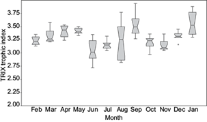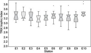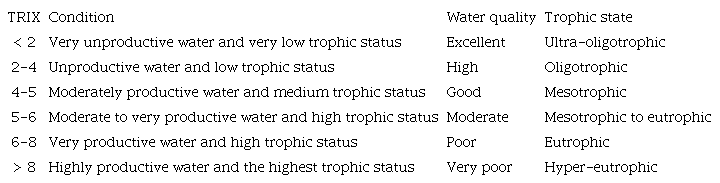 This index was calculated for each nutrient and for chlorophyll-a. A value greater than 5 is characteristic of eutrophic waters, while values between 3 and 5 correspond to mesotrophic waters and lower than 3 to oligotrophic waters (Karydis et al. 1983). Additionally, the TRIX trophic index was estimated according to the following equation (Vollenweider et al. 1998):