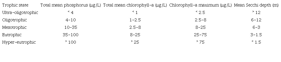 Additionally, the data were compared with the limits established by the Organization for Economic Co-operation and Development (Table II, Vollenweider and Kerekes 1981). The data for each nutrient and chlorophyll-a were graphed using the program Surfer 7.0.