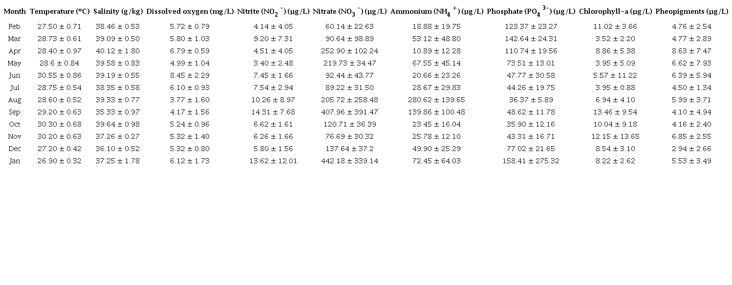 where Chla is the chlorophyll-a concentration (μg/l), D%O the 100-percentage of dissolved oxygen saturation, NID the concentration of dissolved inorganic nitrogen (μg/l), and PT the total phosphorus concentration (phosphate concentration in μg/L was used in this study). The values 1.2 and 1.5 are coefficients to set the lower limits of the index and the scale interval between 0 and 10. The data obtained were compared with the classification scale indicated in Table I. These indices were developed for marine and coastal waters in subtropical seas; however, they have been widely used in tropical environments around the world (Anguiano-Cuevas et al. 2015, López-Monroy and Troccoli-Ghinaglia 2018, Cutrim et al. 2019, Dewi et al. 2019).