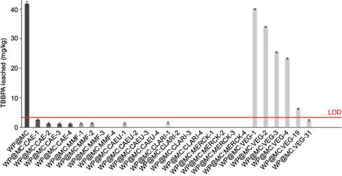 Figure 4 shows a relative quantification of BPA leached from the curing waters. The general tendency for the stabilization of BPA, the amount of activated carbon used in the production of RPAs is similar to that observed in TBBPA. The greater the dosage, the lower the BPA leached. However, it is important to notice that while all activated carbons show similar behaviors, the Merck carbon proved to be more effective for the stabilization of BPA, though its IN or specific surface area is not the largest of all tested carbons. This could be evidence that, to some degree, other parameters such as the zeta potential or temperature can affect the efficiency of coal as a stabilizing agent. Still, it has been proven that IN is a robust parameter to anticipate the performance of a given carbon for stabilizing BFRs in the production of RPAs.