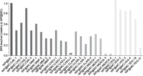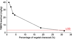 For the use of non-activated vegetal charcoal, the analysis of BPA leaching in pore waters was similar to the one observed for TBBPA. The amount of BPA leached in dosages of 1.1 to 18.5 % is considerable, but it can be said that in the dosage of 31.3 % stabilization of BPA is efficient.
