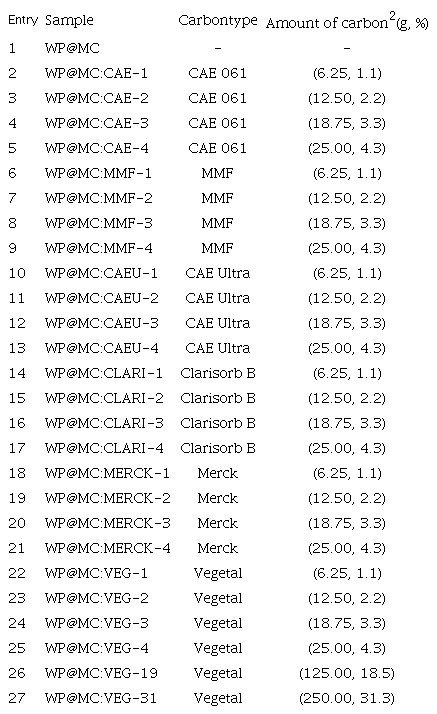 Twenty-seven different RPAs were prepared. All samples were made using 250 g of WP covered with a mixture prepared with 300 g of MC, different amounts and types of AC and 100 mL of water (Table I).