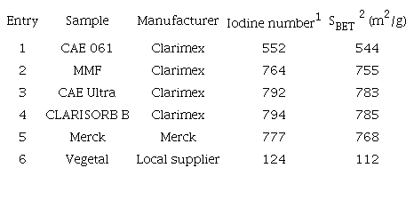 As can be observed on table II, it is possible to divide the activated carbons employed in three categories: low IN (Vegetal), medium IN (CAE 061) and high IN (the rest of the carbons tested). This means that Vegetal charcoal is the less porous, while Merck, MMF, CAE Ultra and Clarisorb B had the highest porous character.