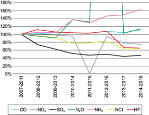 Centrando el análisis en los valores obtenidos para compuestos ácidos (NOx como SO2) (Fig. 1), hay una disminución del índice con tendencia a ser constante, debido a la implementación de MTD, tales como sistemas de desulfuración y reducción no catalítica de dióxido de nitrógeno. Lo mismo ocurre con el HCl y el HF, cuyas emisiones disminuyen y sus medidas se basan en sistemas de control de Cl y F en materias primas y combustibles.