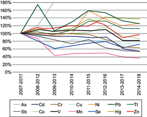 Para los componentes pertenecientes a la familia de los metales pesados y de transición (Fig. 2) se observa en general una amplia variabilidad, pero se aprecia una cierta constancia para cada contaminante específico; a causa de ello (como se explicó antes), la calidad de las mediciones efectuadas en la primera campaña, cuyos valores se toman como referencia y a partir las cuales se efectúan los cálculos de índices, era inadecuada, ya que era la dictada por la legislación vigente del momento. Esto provoca una dispersión estadística en las medidas puntuales, puesto que los métodos de medición se tienen que adaptar en función de las modificaciones de las normativas vigentes.