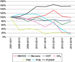 En el caso de los compuestos orgánicos (Fig. 3), éstos presentan una reducción global significativa, aunque en algunos casos, tales como PCDD/F y bencenos, las incertidumbres de métodos de medición y las interrelaciones entre compuestos pueden generar incrementos en las incertidumbres en los valores.