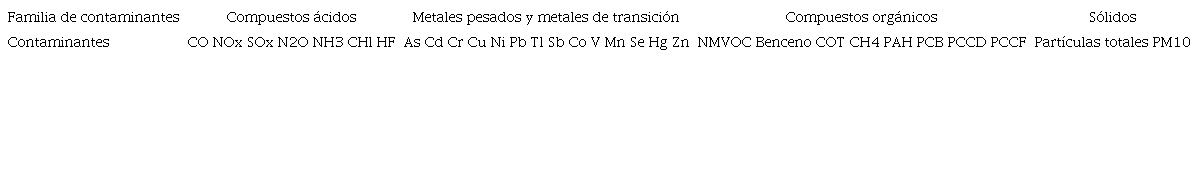 Recopilando la legislación aplicable al sector cementero en España relacionada con las emisiones (Canales et al. 2003) y con la información disponible en el Inventario Nacional y el Registro PRTR-España (Canales et al. 2003), se determinó que las sustancias más características seleccionadas y agrupadas por familias son las reflejadas en el cuadro I.