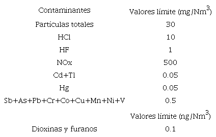 En el presente estudio, todos los valores límite a los que hace referencia el cuadro II se establecieron como valores medios durante un periodo de tiempo. En el caso de PST, HCl, HF y NOx, se consideró una medida continua; para metales pesados (Cd+Tl, Hg, Sb+As+Pb+Cr+Co+Cu+Mn+Ni+V) se determinó un rango de tiempo variable (30 min-8 h). Para dioxinas y furanos (PCCD y PCCF), el intervalo de tiempo varió de 6 a 8 h, siendo estos valores el mínimo y el máximo.