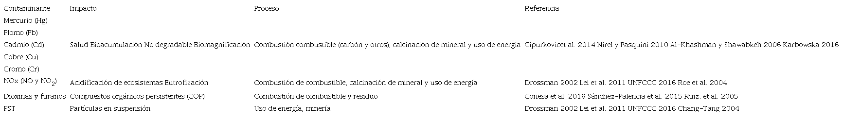 Durante la revisión del estado del arte que se realizó en este estudio, se observaron todos los aspectos posibles en los que influyen los contaminantes característicos de la industria cementera. En el cuadro III se muestran los impactos causados por las sustancias emitidas que forman parte de este estudio.