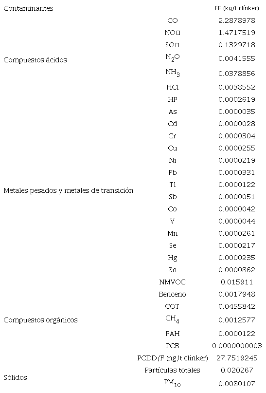 Los FE deben ser lo más representativos del sistema industrial en cuestión y basarse en datos reales de la actividad específica. Para el caso en estudio, emisiones de la industria cementera, existen numerosas referencias bibliográficas sobre factores de emisión que, además, son propuestos por organismos de prestigio internacional, entre los que cabe destacar la Guía de inventarios de emisiones de contaminantes atmosféricos EMEP/AEMA (EMEP/EEA 2013), una guía indispensable para la realización de inventarios nacionales de emisiones en Europa o el Documento de referencia sobre las mejores técnicas disponibles en la industria de fabricación de cemento, cal y óxido de magnesio (BREF), el cual describe los FE calculados a partir de datos de concentración (Schorcht et al. 2013).