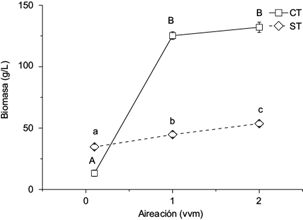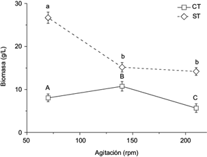 En la figura 3 se observa que en condiciones de agitación mayores a 70 rpm se afecta negativamente la producción de S. maltophilia. A pesar de que la agitación es importante para la adecuada mezcla y promoción de una buena transferencia de masa y calor, las condiciones de una agitación elevada pueden afectar negativamente el crecimiento de algunos microorganismos debido a la generación de fuerzas de corte que alteran la morfología, variaciones en tamaño y daños celulares (Atkinson y Mavituna 1985). En la figura 4 se muestra el papel detonante de la aireación en el incremento de la biomasa en el cultivo, sobre todo en el caso de C. tropicalis. En conjunto con la agitación, la aireación normalmente satisface la demanda de oxígeno en un proceso de fermentación. La aireación es benéfica para el crecimiento y desempeño de las células microbianas mediante el incremento de las condiciones de transferencia de masa respecto al sustrato, producto y oxígeno (Atkinson y Mavituna 1985).