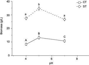 En este sentido, en el presente trabajo sólo se evaluaron las condiciones de operación del biorreactor para alcanzar las condiciones óptimas de crecimiento de S. maltophilia y C. tropicalis a nivel de laboratorio, utilizando como fuente de carbono un azúcar simple y peptona como fuente de nitrógeno. El efecto del control de cada parámetro sobre la biomasa producida por ambas cepas es notorio (Figs. 1-4). En el caso de C. tropicalis, se había reportado una temperatura óptima de crecimiento de 32 ºC a pH de 7 (Chang et al. 1998). Otros autores, como Basak et al. (2013), encontraron una temperatura óptima de 30 ºC a pH de 6 y 150 rpm en ensayos para la degradación de 4-clorofenol. Aunque no se ha probado el efecto de la aireación sobre el crecimiento de C. tropicalis, sí se ha reportado su actividad en fermentadores aireados con 0.325 vvm (Guneser et al. 2016). Chandran y Das (2012) reportaron valores de producción de biomasa de 3.5 g/L a 35 ºC y pH 5 con dichos parámetros de cultivo, mientras que Mohamad et al. (2013) reportaron 12 g/L.