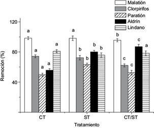 Se demostró la capacidad de remoción de malatión, clorpirifos, paratión, aldrín y lindano por la levadura C. tropicalis y la bacteria S. maltophilia (Fig. 5). En el caso de malatión no hubo diferencias significativas (P < 0.05) entre la actividad de ambas especies, pero si con relación al consorcio. Los valores de remoción de ambas cepas fueron mayores a 98 %. Para clorpirifos, el tratamiento con C. tropicalis presentó una degradación significativamente mayor (P < 0.05) del plaguicida (74.23 %). En el caso del metil paratión, el mayor porcentaje de degradación (P < 0.05) ocurrió con S. maltophilia (63.23 %). En la degradación de aldrín el análisis estadístico muestra diferencias significativas (P < 0.05), observándose que el consorcio C. tropicalis/S. maltophilia logró una mayor degradación del plaguicida (87.03 %) y que de ambas cepas, S. maltophilia obtuvo los mejores resultados (80.17 %). En los microcosmos contaminados con lindano, los resultados indican que la mayor degradación del plaguicida (81.01 %) se observó con el tratamiento con C. tropicalis (P < 0.05). En el cuadro I se muestran los resultados del rendimiento de extracción de cada plaguicida y el porcentaje de degradación abiótica. El rendimiento de extracción fue variable, siendo el lindano (97 %), el plaguicida que se recuperó casi en su totalidad. En cuanto a la degradación abiótica, el clorpirifos etil (9.95 %) presentó el valor significativamente más alto (P < 0.05), seguido del malatión (6.33 %). No se presentó degradación abiótica significativa para el paratión metílico y el lindano.