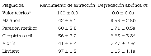 Con la finalidad de evidenciar la biodegradación por parte de las cepas en estudio, sin contar con la determinación de productos finales de degradación en los ensayos, se propuso establecer dos tratamientos control que mostraran los valores de degradación abiótica de cada plaguicida. El primer control ayudó a determinar la máxima concentración de plaguicida que se podía extraer de la matriz del microcosmos, y el segundo dio información sobre el porcentaje de degradación abiótica (Cuadro I). En este sentido, los porcentajes de degradación abiótica se encuentran por debajo del 10 % en los microcosmos estudiados.
