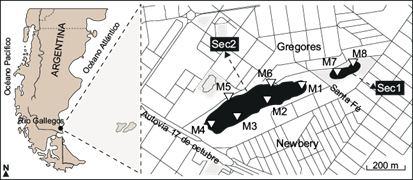 La LMG forma parte del SRNU de la ciudad de Río Gallegos, siendo una de las de mayor superficie con aproximadamente 11.29 ha. Se localiza en el interior de la ciudad (51º 37’ 31.38’’ S-69º14’ 31.53’’ O) y protege un humedal natural que brinda invaluables servicios ambientales a los vecinos de la comunidad. Actúa como centro natural de filtrado urbano y depósito de precipitaciones. La riqueza máxima de aves registrada fue de 34 especies, entre las que destacan numerosas aves acuáticas como cisnes, patos y macaes (Podiceps spp.), además de playeras (Ferrari y Montero 2015). Actualmente la laguna se encuentra dividida en dos cuerpos de agua (Fig. 1), de los cuales el de menor tamaño (Sec1) ha sido totalmente modificado para la realización de actividades recreativas como ciclismo, caminatas, juegos de niños, etc. El de mayor tamaño (Sec2) suele utilizarse para esparcimiento, con actividades como práctica del kayak, educación ambiental y otras; al estar menos modificado, las aves suelen preferirlo para descansar y alimentarse. El eje longitudinal de la Sec1 mide aproximadamente 160 m, con un ancho promedio de 46 m. Por su parte, la Sec2 tiene un largo aproximado de 515 m, con un ancho promedio de 120 m. Ambas secciones tienen una profundidad aproximada un poco superior a 1 m en su parte más profunda.
